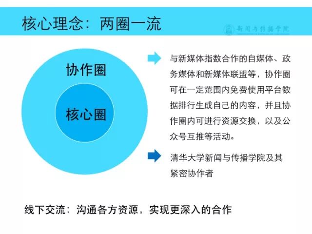 玩数据的时候我们构建的模式叫两圈一流。清华新闻与传播学院是我们整个平台最核心的组成。在外围是跟我们做各种联盟、技术合作、共同发布数据的协作圈。