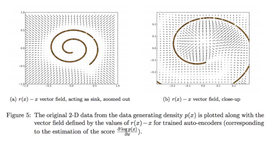 我们经常在机器学习中遇到的则是另一个种(但不经常将其视为矢量场)是由自动编码器定义的矢量场。 AE的输入一些向量x,并返回另一个相同大小的向量v(x)。比如在图5是Alain和Bengio在201年对2D数据的自动编码去噪声的矢量场训练,效果相当不错: