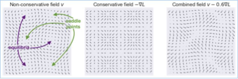这个向量场在零和游戏中经常出现(译者注:zero-sum game就是指“零和博弈”,指参与博弈的各方,在严格竞争下,一方的收益必然意味着另一方的损失,博弈各方的收益和损失相加总和永远为“零”,双方不存在合作的可能),其中