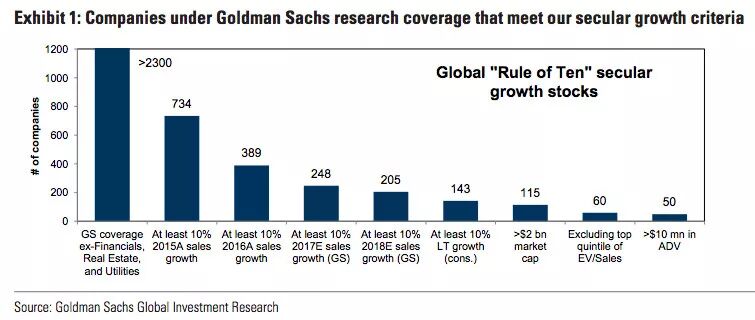 基于这种美国经济增长加速下滑、其他地区温和增长的背景,高盛从全球2300只个股中挑出了50只在这种环境下表现最佳的个股,其号称“十规则”(Rule of Ten)的筛选标准包括: