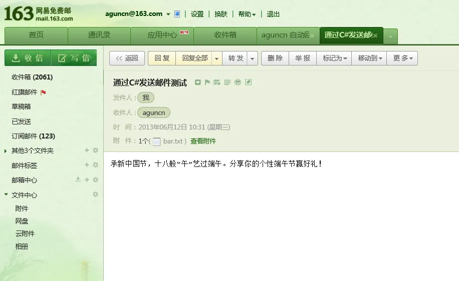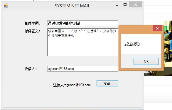 1 using System; 2 using System.Collections.Generic; 3 using System.ComponentModel; 4 using System.Data; 5 using System.Drawing; 6 using System.Linq; 7 using System.Text; 8 using System.Threading.Tasks; 9 using System.Windows.Forms; 10 using System.Net.Mail; 11 12 namespace WindowsFormsApplication2 13 { 14 public partial class Form1 : Form 15 { 16 public Form1() 17 { 18 InitializeComponent(); 19 } 20 21 private void button1_Click(object sender, EventArgs e) 22 { 23 string file = "E:\\bar.txt"; 24 MailAddress from = new MailAddress("aguncn@163.com"); 25 MailAddress to = new MailAddress(textBox2.Text); 26 MailMessage message = new MailMessage(from, to); 27 message.Subject = textBox1.Text; 28 message.Body = richTextBox1.Text; 29 Attachment myAttachment = new Attachment(file, System.Net.Mime.MediaTypeNames.Application.Octet); 30 System.Net.Mime.ContentDisposition disposition = myAttachment.ContentDisposition; 31 disposition.CreationDate = System.IO.File.GetCreationTime(file); 32 disposition.ModificationDate = System.IO.File.GetLastWriteTime(file); 33 disposition.ReadDate = System.IO.File.GetLastAccessTime(file); 34 message.Attachments.Add(myAttachment); 35 SmtpClient client = new SmtpClient("smtp.163.com", 25); 36 client.Credentials = new System.Net.NetworkCredential("aguncn@163.com", "********"); 37 client.Send(message); 38 MessageBox.Show("发送成功"); 39 40 } 41 } 42 }