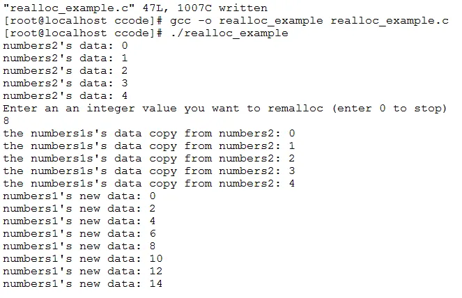 1 [root@localhost ccode]# cat realloc_example.c 2 #include <stdio.h> 3 #include <stdlib.h> 4 5 int main(int argc, char* argv[], char* envp[]) 6 { 7 int input; 8 int n; 9 int *numbers1; 10 int *numbers2; 11 numbers1 = NULL; 12 13 if((numbers2 = (int *)malloc(5 * sizeof(int))) == NULL) 14 { 15 printf("malloc memory unsuccessful."); 16 numbers2 = NULL; 17 exit(1); 18 } 19 20 for(n = 0; n < 5; n++) 21 { 22 *(numbers2 + n) = n; 23 printf("numbers2's data: %d\n", *(numbers2 + n)); 24 } 25 printf("Enter an an integer value you want to remalloc (enter 0 to stop)\n"); 26 scanf("%d",&input); 27 numbers1 = (int *)realloc(numbers2, (input + 5) * sizeof(int)); 28 if(numbers1 == NULL) 29 { 30 printf("Error (re)allocating memory"); 31 exit(1); 32 } 33 34 for(n = 0; n < 5; n++) 35 { 36 printf("the numbers1s's data copy from numbers2: %d\n", *(numbers1 + n)); 37 } 38 for(n = 0; n < input; n++) 39 { 40 *(numbers1 + 5 +n) = n * 2; 41 printf("numbers1's new data: %d\n",*(numbers1 + 5 + n)); 42 } 43 printf("\n"); 44 free(numbers1); 45 numbers1 = NULL; 46 return 0; 47 }