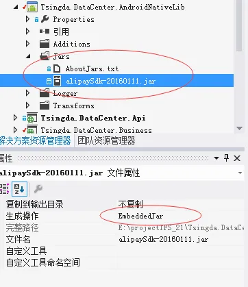 三 下面的android Sdk事实上我们需要的是jar文件,我们新建一个“android绑定库项目“,然后把jar文件放到jars文件夹里,把它的生成方式改成“EmbeddedJar”,然后在目标的android应用程序里引用它即可