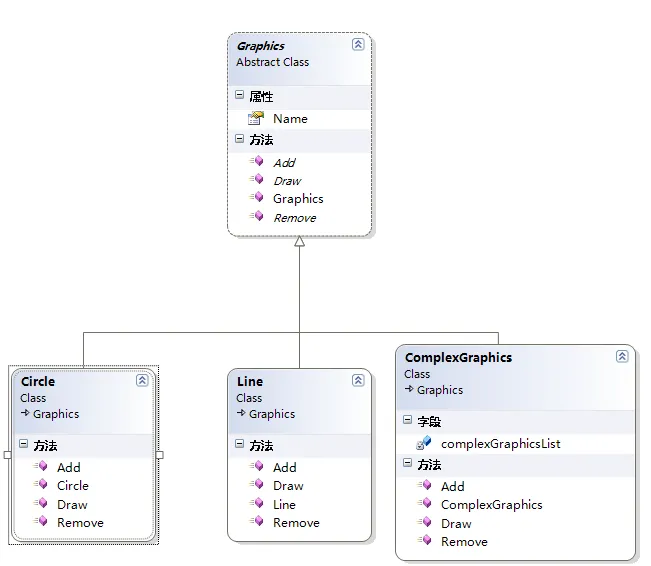 - 树枝构件(Composite)角色:代表参加组合的有下级子对象的对象,上面实现中ComplexGraphics充当这个角色,树枝对象给出所有管理子对象的方法实现,如Add、Remove等。