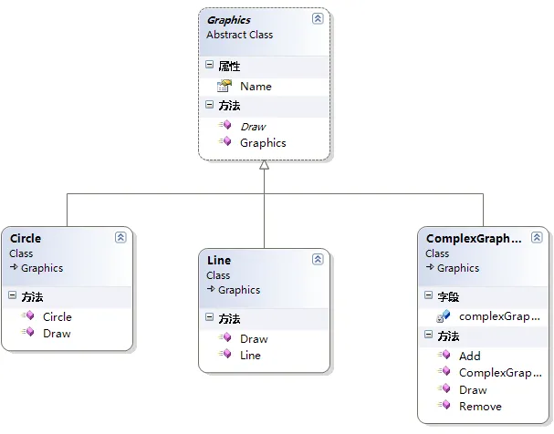 组合模式允许你将对象组合成树形结构来表现”部分-整体“的层次结构,使得客户以一致的方式处理单个对象以及对象的组合。下面我们用绘制的例子来详细介绍组合模式,图形可以由一些基本图形元素组成(如直线,圆等),也可以由一些复杂图形组成(由基本图形元素组合而成),为了使客户对基本图形和复杂图形的调用保持一致,我们使用组合模式来达到整个目的。