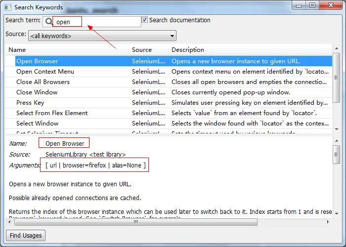 如上图,自动化脚本从打开浏览器开发,如上图,我想打开一个浏览器,想的是“open”为关键字进行搜索,结果找到了一个“Open Browser”的关键字,点击这个关键字,想显示它的用法和说明。