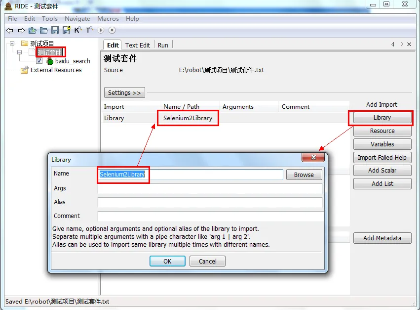 在“测试套件”的Edit标签页,点击“Library”按钮,弹出输入框,Name输入:Selenium2Library ,点击OK 完。
