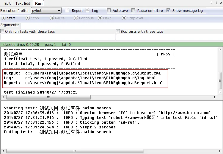 运行信息显示会生成三个文件:Output.xml、Log.html、Report.html