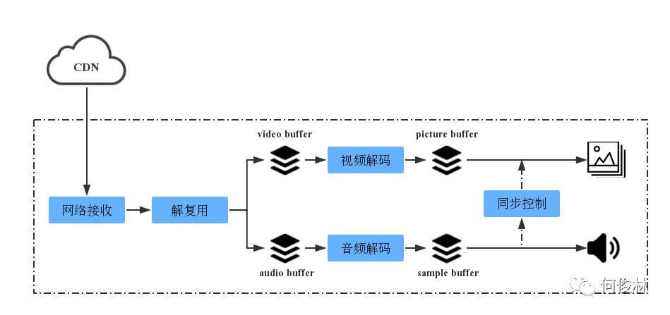 随着互联网技术的飞速发展,移动端播放视频的需求如日中天,由此也催生了一批开源/闭源的播放器,但是无论这个播放器功能是否强大、兼容性是否优秀,它的基本模块通常都是由以下部分组成:事务处理、数据的接收和解复用、音视频解码以及渲染,其基本框架如下图所示: