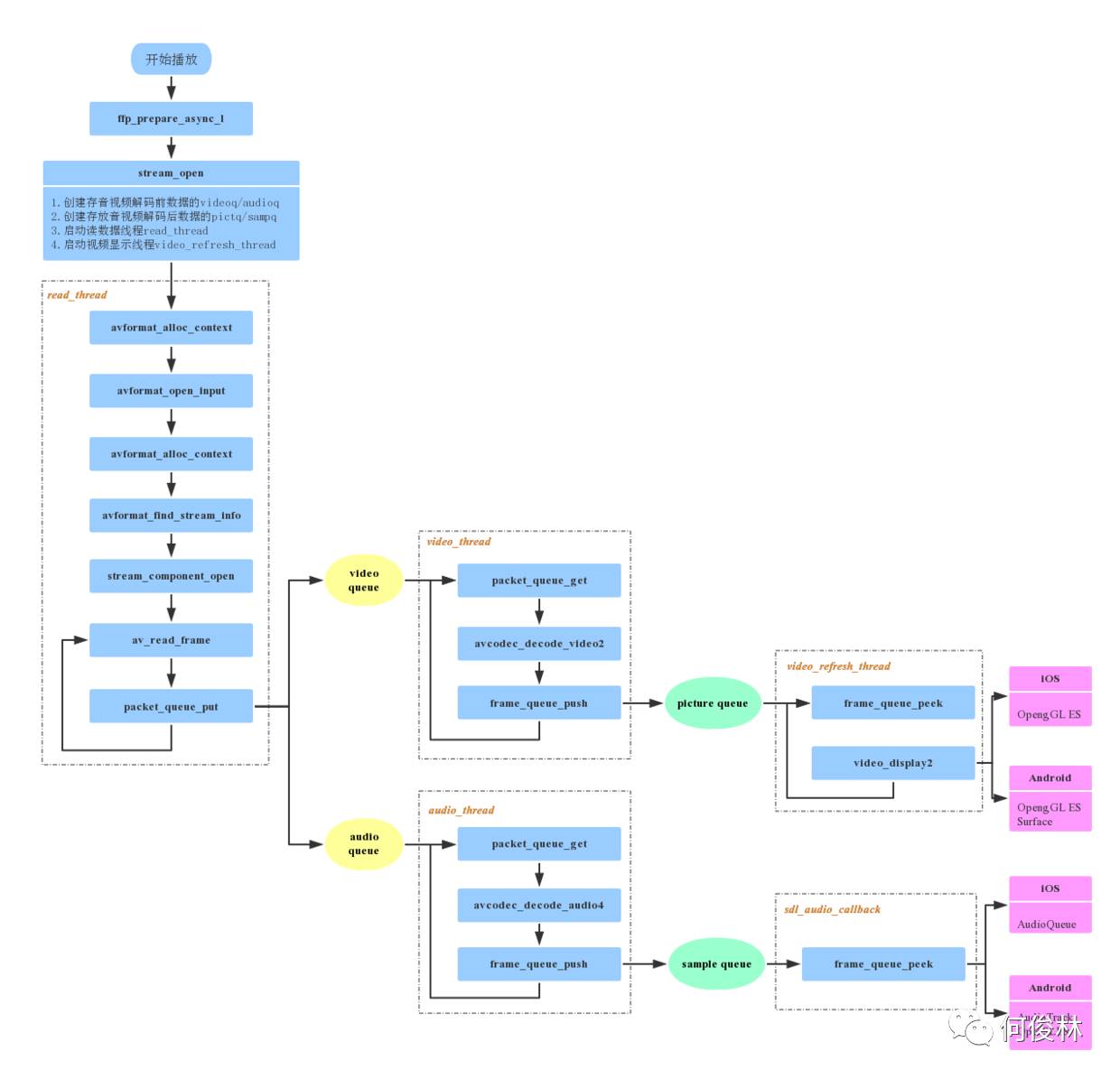 至此已经完成了ijkplayer播放器初始化的相关流程,简单来说,就是创建播放器对象,完成音视频解码、渲染的准备工作。在下一章节中,会重点介绍播放的核心代码。