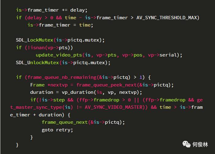 如果当前这一帧的播放时间已经过了,并且其和当前系统时间的差值超过了AV_SYNC_THRESHOLD_MAX,则将当前这一帧的播放时间改为系统时间,并在后续判断是否需要丢帧,其目的是为后面帧的播放时间重新调整frame_timer,如果缓冲区中有更多的数据,并且当前的时间已经大于当前帧的持续显示时间,则丢弃当前帧,尝试显示下一帧。