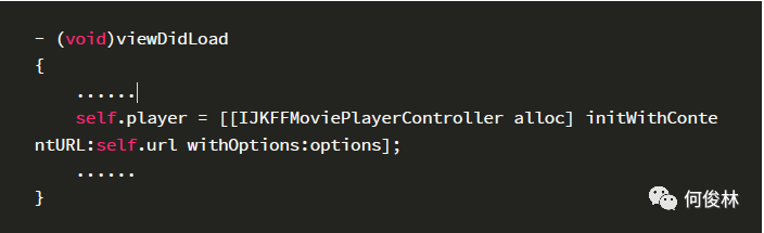 初始化完成的主要工作就是创建播放器对象,打开ijkplayer/ios/IJKMediaDemo/IJKMediaDemo.xcodeproj工程,可看到IJKMoviePlayerViewController类中viewDidLoad方法中创建了IJKFFMoviePlayerController对象,即iOS平台上的播放器对象。