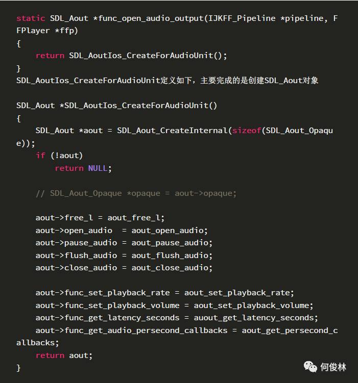 ffpipeline_open_audio_output方法实际上调用的是IJKFF_Pipeline对象的函数指针func_open_audio_utput,该函数指针在初始化中的ijkmp_ios_create方法中被赋值,最后指向的是func_open_audio_output