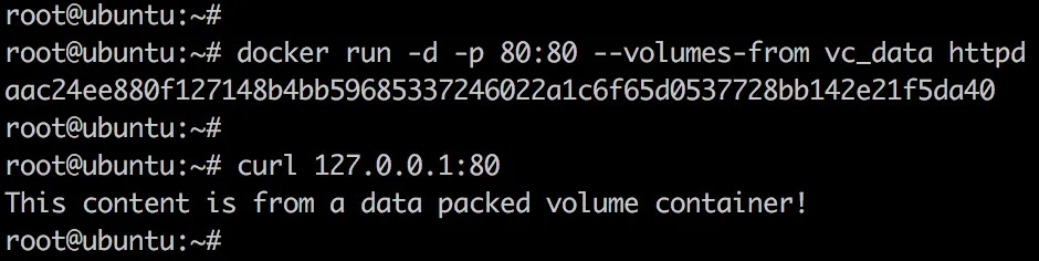 因为在 Dockerfile 中已经使用了 VOLUME 指令,这里就不需要指定 volume 的 mount point 了。启动 httpd 容器并使用 data-packed volume container: