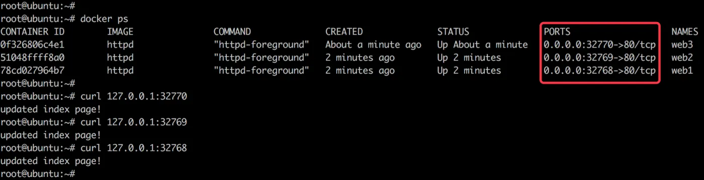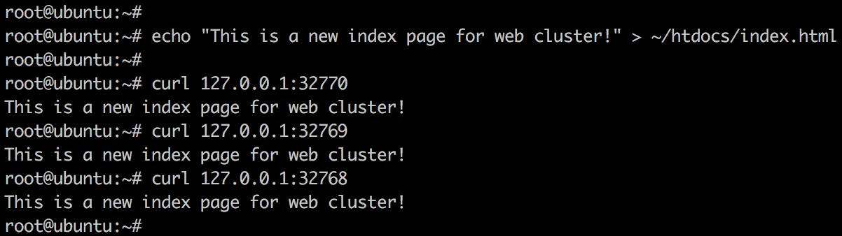 修改 volume 中的主页文件,再次查看并确认所有容器都使用了新的主页。