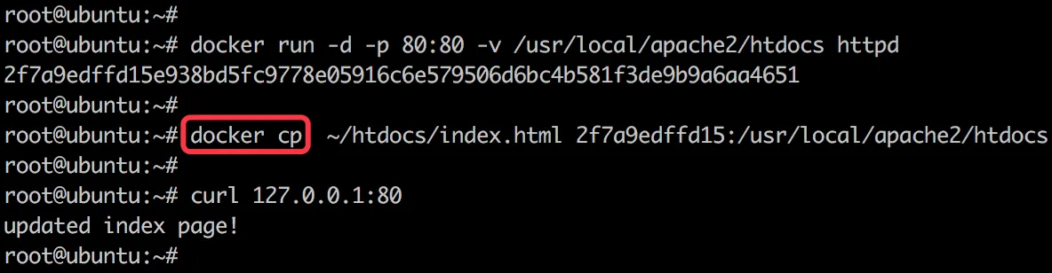 docker cp 可以在容器和 host 之间拷贝数据,当然我们也可以直接通过 Linux 的 cp 命令复制到 /var/lib/docker/volumes/xxx。