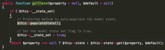 从函数参数和官方注释,可以知道,getState()函数功能是获取一个model的属性及属性对应的值,getState()函数在model的属性未设置时,会执行$this->populateState()来对model的一些属性进行赋值操作。