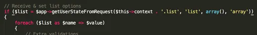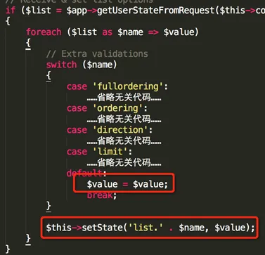 代码对取到的list[]数组进行了遍历,并做相应的过滤、拆分,可以看到list[select]没有处理逻辑,会进入default的case,后续$this->setState(‘list.’ . $name, $value)代码执行后,导致请求中list[select]变量没有任何变量被直接赋值给Model属性,继续回头看文章最开始的注入位置,此时我们可以控制$this->getState(‘list.select’)的返回值,构造SQL注入。