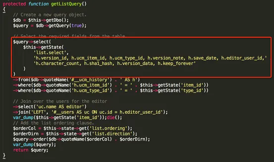 漏洞触发的代码位于:/administrator/components/com_contenthistory/models/history.php,getListQuery()函数内: