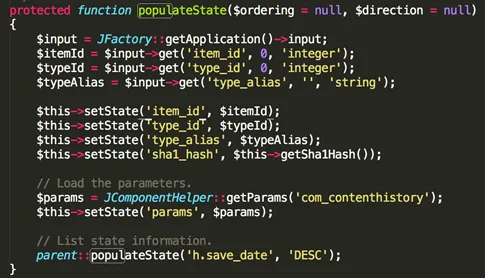 我们跟进populateState()函数看下做了什么操作,代码位于:/administrator/components/com_contenthistory/models/history.php 内: