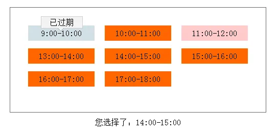 <!DOCTYPE html> <html> <head> <title></title> <meta http-equiv="Content-Type" content="text/html; charset=UTF-8"> <script type="text/javascript" src="http://files.cnblogs.com/kuikui/jquery.js"></script> <style type="text/css"> *{margin:0px;padding: 0px;} #test{ width: 430px; padding: 35px; border: 1px solid #666666;overflow: hidden; margin: 100px auto 0px;} #test span{display:block; background: #FF6600; width:130px; height: 30px; line-height: 30px; text-align: center; float:left; _display:inline; position:relative; margin-bottom: 15px; cursor: pointer;} #test .mspan{margin-right: 20px;} #test .unspan1{background: #D2E0E6; cursor:default} #test .unspan2{background: #ffcaca; cursor: default;} #test label{position: absolute; left:25px; top:-18px; width: 60px; line-height: 20px; background: #F3F3F3; padding:1px 10px; border:1px solid #CCCCCC;display: none;} #test em{display: block;border-color: #F3F3F3 transparent transparent transparent;border-style: solid;border-width: 6px 6px 6px 6px; padding: 0;width: 0;height: 0; font-size: 0;line-height: 0; position: absolute;left:58px; top:5px;display:none; _border-top-color: #F3F3F3;_border-bottom-color: #F3F3F3; _filter: chroma( color = #F3F3F3); } #result{ margin: 10px auto 0px; text-align: center} </style> </head> <body> <div id="test"> </div> <div id="result"></div> <script type="text/javascript"> var mcode = { "minfo": [ { "time": "9:00-10:00", "status": 2 }, { "time": "10:00-11:00", "status": 1 }, { "time": "11:00-12:00", "status": 3 }, { "time": "13:00-14:00", "status": 1 }, { "time": "14:00-15:00", "status": 1 }, { "time": "15:00-16:00", "status": 1 }, { "time": "16:00-17:00", "status": 1 }, { "time": "17:00-18:00", "status": 1 } ] }; var html = ''; for(var i in mcode.minfo){ if(mcode.minfo[i].status===2){ html+='<span class="unspan1 '; } else if(mcode.minfo[i].status===3){ html+='<span class="unspan2 '; } else{ html+='<span class=" '; } if((i+1)%3===0){ html+='" >'; } else{ html+='mspan" >'; } html+=mcode.minfo[i].time; if(mcode.minfo[i].status===2){ html+='<label>已过期</label>'; } else if(mcode.minfo[i].status===3){ html+='<label>已选满</label>'; } if(mcode.minfo[i].status!==1){ html+='<em></em>'; } html+="</span>"; } $("#test").empty().html(html); $.each($("#test span"),function(k,v){ if($(this).hasClass("unspan1")||$(this).hasClass("unspan2")){ $(this).hover(function(){ $(this).find("label").css({"display":"block"}); $(this).find("em").css({"display":"block"}); }, function(){ $(this).find("label").css({"display":"none"}); $(this).find("em").css({"display":"none"}); }); } else{ $(this).click(function(){ $("#result").empty().html("您选择了:"+$(this).text()); }); } }); </script> </body> </html>