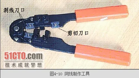 EIA/TIA对双绞线的连接制定了标准,使用数据通信更加规范而且在以后的布线实施过程非常简单。EIA/TIA将双绞线连接标准分为两类:EIA/TIA568A和EIA/TIA568B标准。EIA/TIA568A的连线标准是:白橙、橙、白绿、蓝、白蓝、绿、白棕、棕; EIA/TIA568B的标准是:白绿、绿、白橙、蓝、白蓝、橙、白棕、棕。一般双绞线的使用时又分为:直连线和交叉线如图4-9所示,双绞线的制做采用专业的网钳制作工具,如图4-10 所示