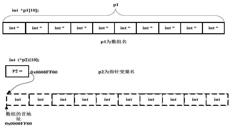 那现在我们清楚p 是一个指针,它指向一个包含10 个int 类型数据的数组,即数组指针