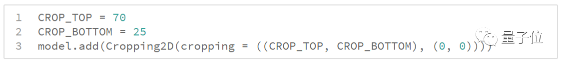 司机视线以下的区域和两边的车道标志一直是自动驾驶技术中研究的重点。这两部分可以使用Keras中的Cropping2D裁剪图像,减少输入到模型中的噪声。