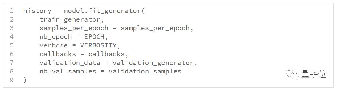最后,我们用生成器来适应模型。由于图像数量庞大,我们无法一次性将整个训练集输入到内训中。因此,需要用生成器批量生产图像以进行训练。