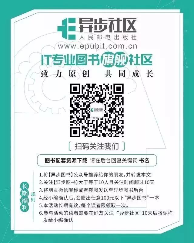 在“异步图书”后台回复“关注”,即可免费获得2000门在线视频课程;推荐朋友关注根据提示获取赠书链接,免费得异步图书一本。赶紧来参加哦!