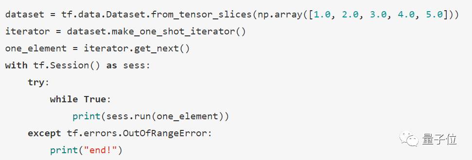 对应的输出结果应该就是从1.0到5.0。语句iterator = dataset.make_one_shot_iterator()从dataset中实例化了一个Iterator,这个Iterator是一个“one shot iterator”,即只能从头到尾读取一次。one_element = iterator.get_next()表示从iterator里取出一个元素。