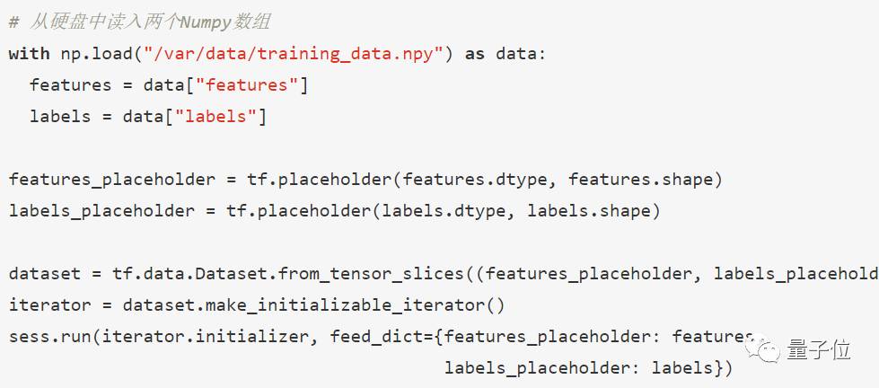 这时,我们可以用一个placeholder取代这里的array,并使用initializable iterator,只在需要时将array传进去,这样就可以避免把大数组保存在图里,示例代码为(来自官方例程):