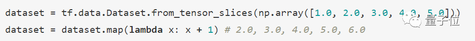 map接收一个函数,Dataset中的每个元素都会被当作这个函数的输入,并将函数返回值作为新的Dataset,如我们可以对dataset中每个元素的值加1: