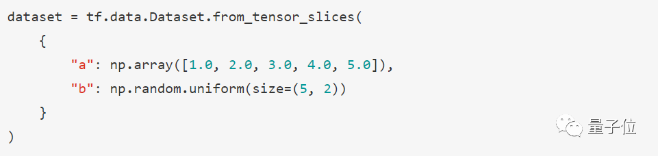 tf.data.Dataset.from_tensor_slices同样支持创建这种dataset,例如我们可以让每一个元素是一个词典: