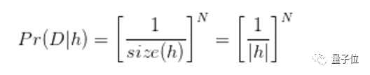 Murphy在MLAPP中用Tenenbaum的强抽样假设(strong sampling assumption)来类比奥卡姆剃刀原理。首先他给出了下面的公式,Pr(D|h)代表了我们重置抽样(sampling with replacement)N次后得到集合D时,某种假设h为真的概率。