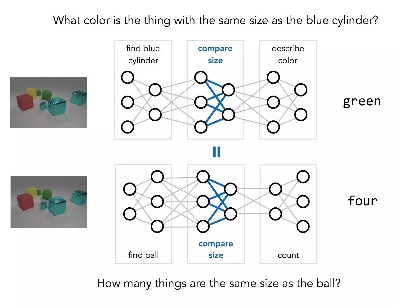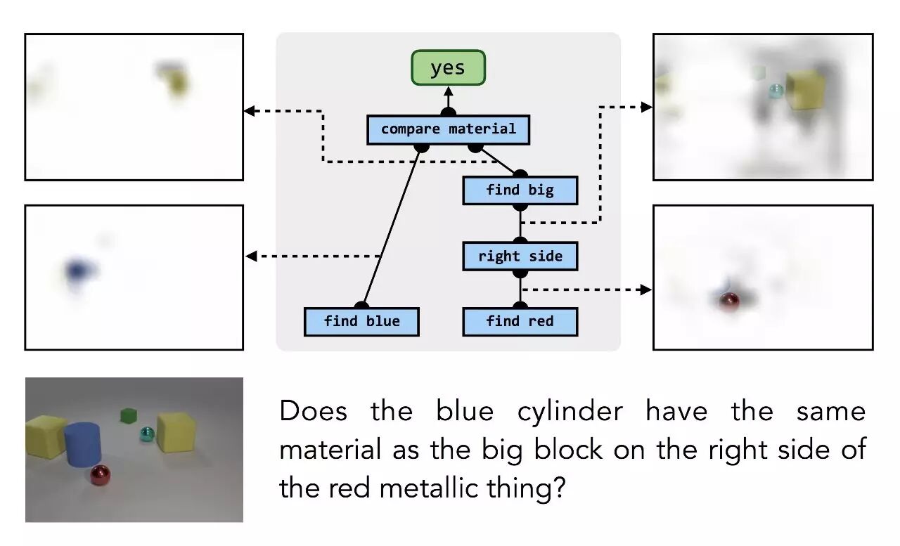 △ 神经网络在处理“蓝色圆柱和红色金属物体右侧的大积木材料一样吗?”这个问题时,自动推断出各个模块负责的运算。