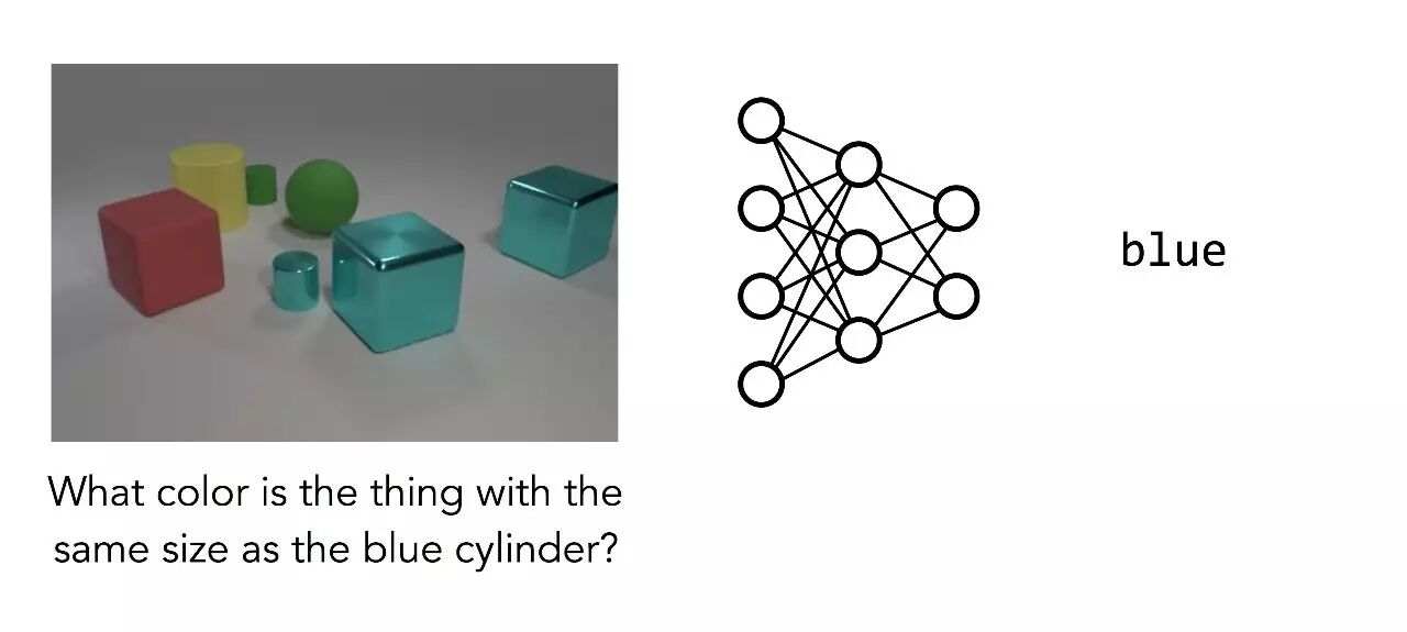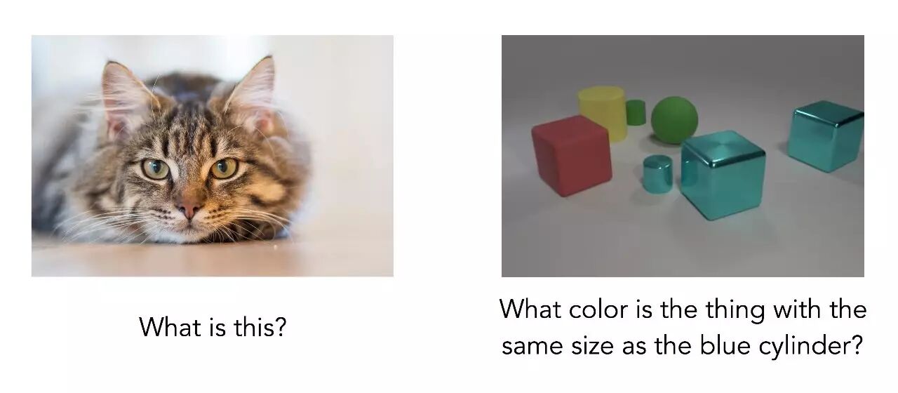 即使是一张更简洁的图片,回答这样的问题仍需要多步推理。模型不能简单地识别图像中的主要物体,而是先要找到蓝色圆柱体,然后找到具有相同大小的另一个物体,再确定其颜色。