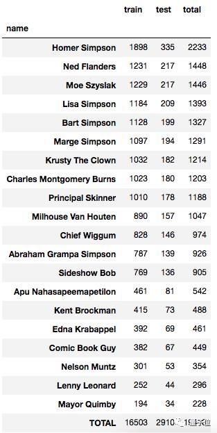该数据集目前有18类,有以下人物:Homer,Marge,Lisa,Bart,Burns,Grampa,Flanders,Moe,Krusty,Sideshow Bob,Skinner,Milhouse等。