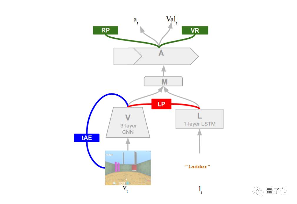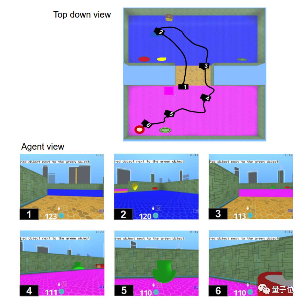 上图是DeepMind论文中所举的例子:一开始agent处于位置1,收到“把绿色物体旁边的红色物体捡起来”的指令,于是它把两个“房间”逛了一遍,去查看房间里的物体及其相对位置,找到了需要捡起来的物体。