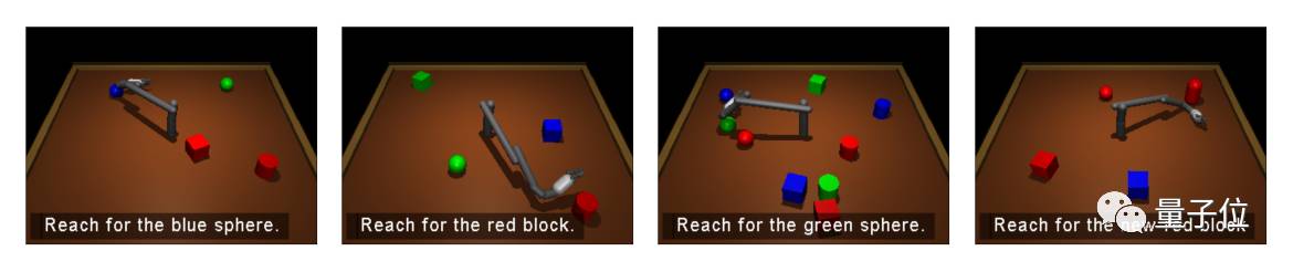 在上图中,最左边一幅的“伸向蓝色球形”是训练环节,其他三幅展示了agent经过这种训练之后的泛化能力,包括目标性质的变化(左二:伸向红色积木)、环境中物体数量的变化(右二:伸向绿色球体,注意这里桌上多了好多积木)、以及新目标性质的出现(右一:伸向新的红色积木)。