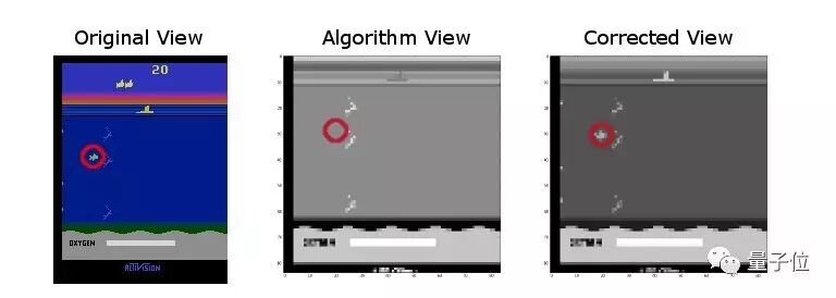 △ 游戏Seaquest的三个图像。左图显示原始图像,中间显示已经转换为灰度的版本,鱼不见了,右侧显示经调整让鱼可见的的灰度版本。