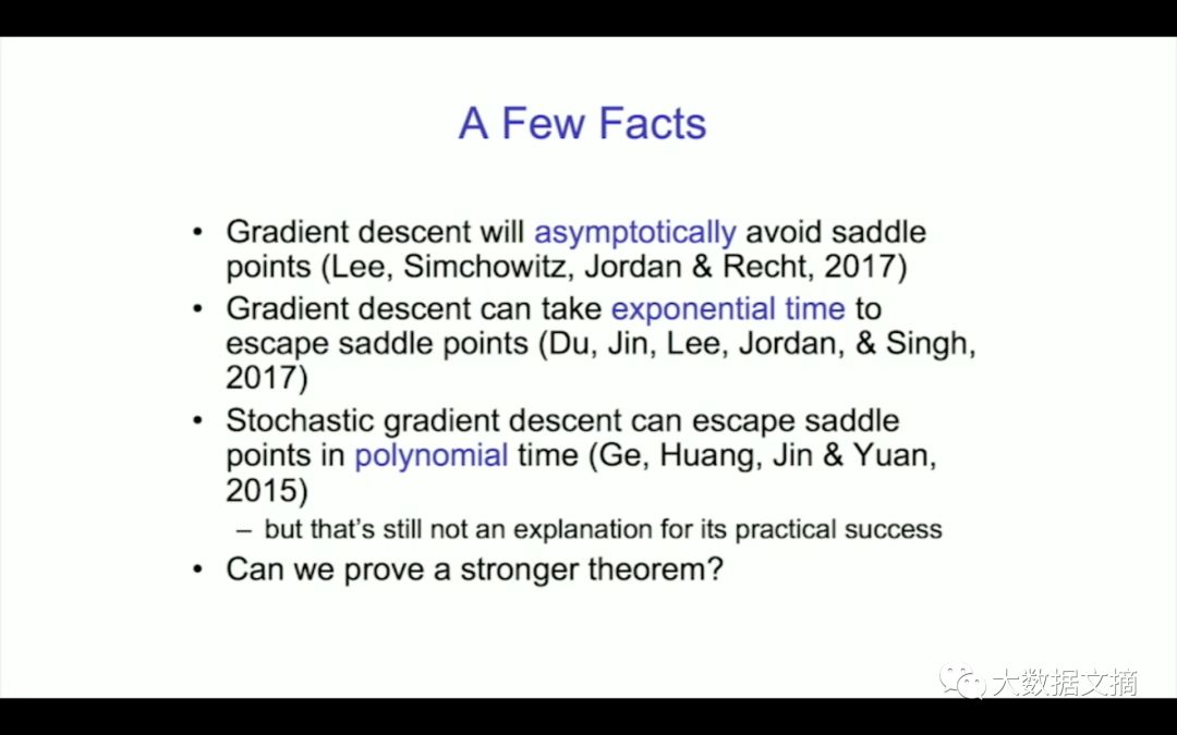 梯度下降可以用指数时间来逃离鞍点,这是另一个新结果。我们都喜欢随机评级,因为每次迭代都很简单。有一篇重要的论文证明在多项式时间内你会逃离鞍点,这是最近的工作。多项式级的复杂度是不好的。这对理论学家来说是好事,但这对实际的操作是不利的。所以这是一个开放问题,我们能否证明一个更强的定理,来理解为什么梯度下降通常是好用的。