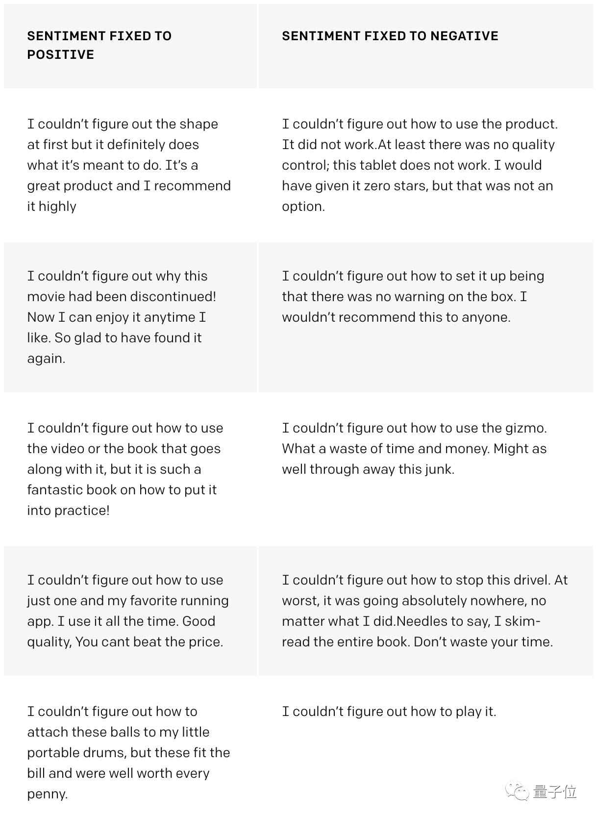 以上表格中所列的,是由已训练模型生成的合成文本的示例。OpenAI的研究人员在确定情感单位的值以确定评价的感情色彩后,从模型中选择随机样本。下面,他们还通过模型传递前缀“我无法弄清楚”,仅选择高似然样本。