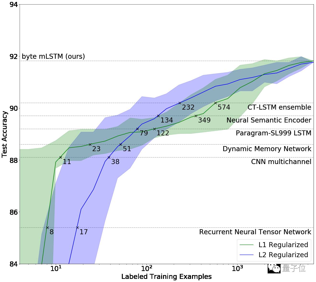 △ 为了让模型的两个变体(绿线和蓝线)能匹敌用6920个示例训练过的完全监督方法(灰色虚线),所需的有标注示例。OpenAI在亚马逊评论中以无监督的方式预训练的L1正则化模型,只需11个有标注示例就能达到multichannel CNN的水平,用232个有标注示例就能匹敌最先进的CT-LSTM Ensembles