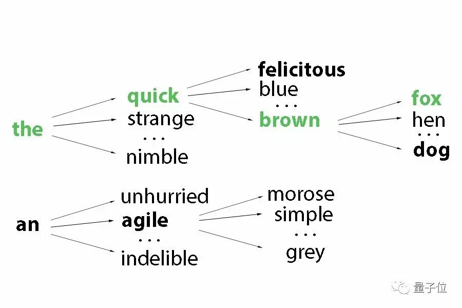 为避免这种情况,一个解决办法是使用一种叫做“集束搜索(Beam Search)”的算法。该算法迭代地使用k个长度为t的最佳句子集合来生成长度为t+1的候选句子,并且能够自动找到最优的k值。这个算法在易于处理推理计算的同时,也在探索生成更合适的标题长度。在下面的示例中,在搜索每个垂直时间步长的粗体字路径中,此算法能够列出一系列k=2的最佳候选句子。