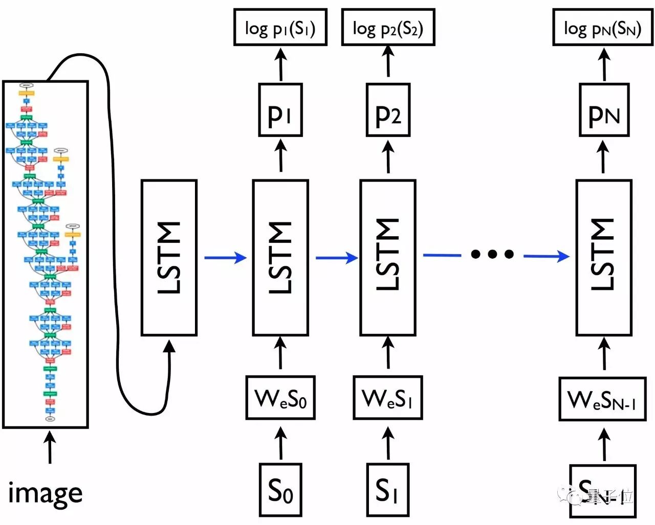 在该图中,{s0,s1,…,sN}表示我们试图预测的描述单词,{wes0,wes1,…,wesN-1}是每个单词的字嵌入向量。LSTM的输出{p1,p2,…,pN}是由该模型基于原有的单词序列为下一个单词生成的概率分布。该模型的训练目标是为了最大化每个单词对数概率的总和指标。