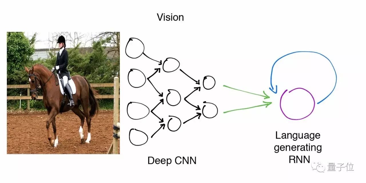 该网络输入马的图像,经由深度卷积神经网络Deep CNN和语言生成模型RNN(循环神经网络)学习训练,最终得到字幕生成网络的模型。