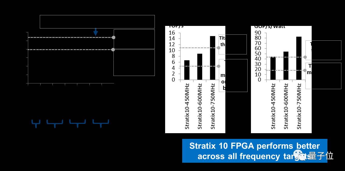 上图右半部分,显示了英特尔Stratix 10 FPGA和TITAN X GPU的ResNet-50的性能和性能/功耗比。即使对于保守的性能估计,英特尔Stratix 10 FPGA已经比实现了TITAN X GPU性能提高了约60%。在性能/功耗比方面,英特尔Stratix 10比TITAN X要好2.3倍到4.3倍。