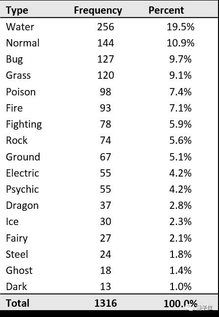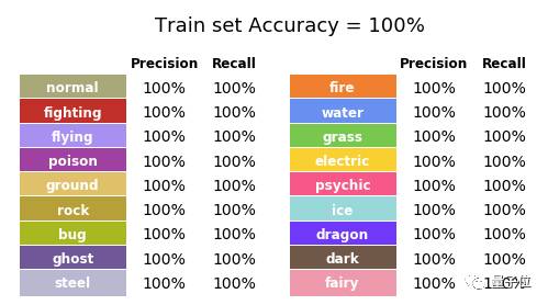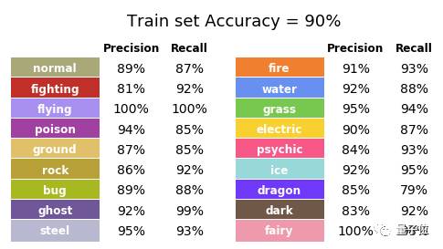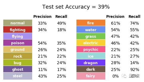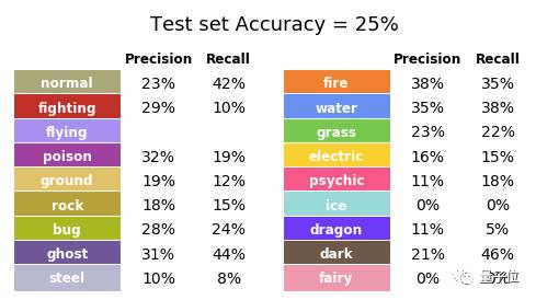 该模型的预测正确率只有39%,可能不那么尽如人意。但是想要利用小样本数据集实现18类精灵的分类问题,并不是那么简单。我们的模型比零规则基线高出了20%的分类准确度。表1列出了在测试集上每个精灵属性出现的频率,比零规则基线高出了19.5%的精度。
