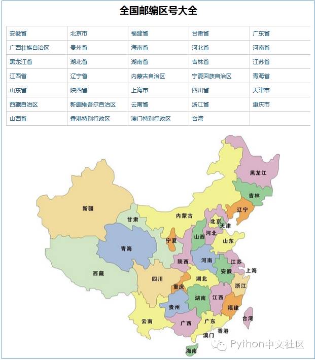 processes=4是最多并发进程数量,使用Pool,还需要关注每个进程的执行结果。下面以多进程抓取全国邮政编码和长途区号为例。目标站点:http://www.ip138.com